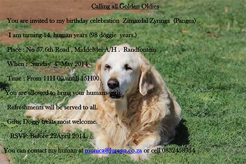 On 18 October 2015 a birthday party was held for Zimaxdal Ladii Chiron, LAYLA. She turned 14 dog years old - 98 human years - on 12 October. She had a mince cake, balloons and received gifts of BILTONG. Three other golden oldies attended. They were the easy guests.
