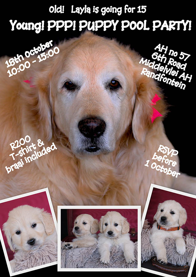 We had a braai and each person received a T-SHIRT with their Goldie's name printed on the back. The youngsters had a BALL swimming and playing with each other and their doggy friends. Fortunately they all passed out at home - much earlier than usual!